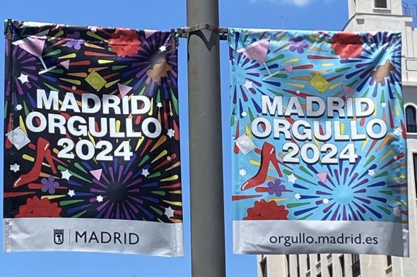 La oposición en el Ayuntamiento de Madrid ha pedido la retirada de los carteles que ha sacado a las calles el Ayuntamiento de Madrid por el Orgullo de 2024 en el que se obvia, como viene siendo habitual desde que gobierna el PP, la bandera LGTBI y se incluyen copas, fuegos artificiales, condones y tacones.