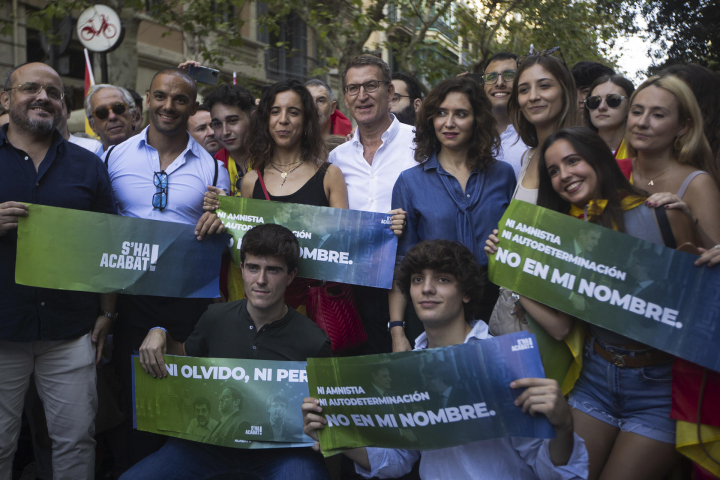 En un mar de banderas españolas y catalanas, se ha podido ver a varios líderes de la derecha y la ultraderecha. Alberto Núñez Feijóo, presidente del PP, ha acudido rodeado de varios de sus barones, entre ellos Isabel Díaz Ayuso, presidenta madrileña, y Alejandro Fernández, líder del PP catalán, con quien ha mantenido roces en los últimos meses.