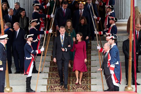 El ambiente en el Congreso era propio de un día especial. Los habituales uniformes de los ujieres y de los policías nacionales se mezclaban con las engalanadas vestimentas de los militares, desde los del Aire hasta los de Tierra, pasando por la banda de la Armada Real. Y en medio de tanta fanfarria y pompa, el sonido de un villancico partiendo de una de las viviendas colindantes a la Cámara Baja hacía recordar que estamos ya en período prenavideño. Por si no quedaba claro, el frío y la débil lluvia situaban al personal allí arremolinado en el día de finales de noviembre en que se celebraba el acto.