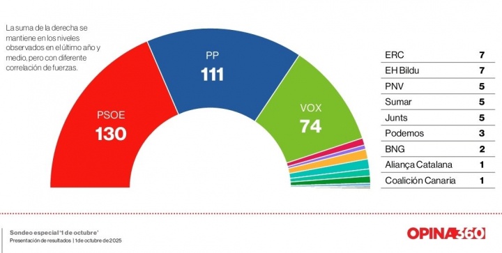 La izquierda sólo tiene la buena noticia del PSOE, puesto que Sumar quedaría reducida a cinco escaños y Podemos, a tres. Por lo demás, ERC quedaría por encima de Junts (siete diputados frente a cinco), Bildu sobre el PNV (también siete frente a cinco) y Aliança Catalana entraría por primera vez en el parlamento español con un diputado.