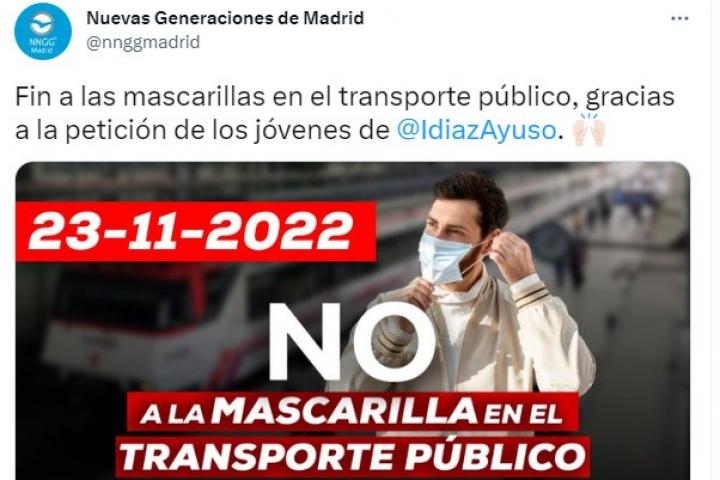 "Fin a las mascarillas en el transporte público, gracias a la petición de los jóvenes de Isabel Díaz Ayuso", se puede leer en el tuit publicado por Nuevas Generaciones del PP.