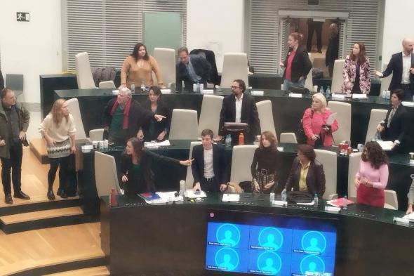 "Esto es inaceptable, señor Fanjul", se le ha oído a Rita Maestre, entre las protestas de Eduardo Rubiño, que intentaba hacerse escuchar mientras el presidente le cortaba entre ironías. "Es vergonzoso", ha espetado el diputado justo antes de abandonar el pleno junto a sus compañeros de Más Madrid y PSOE.