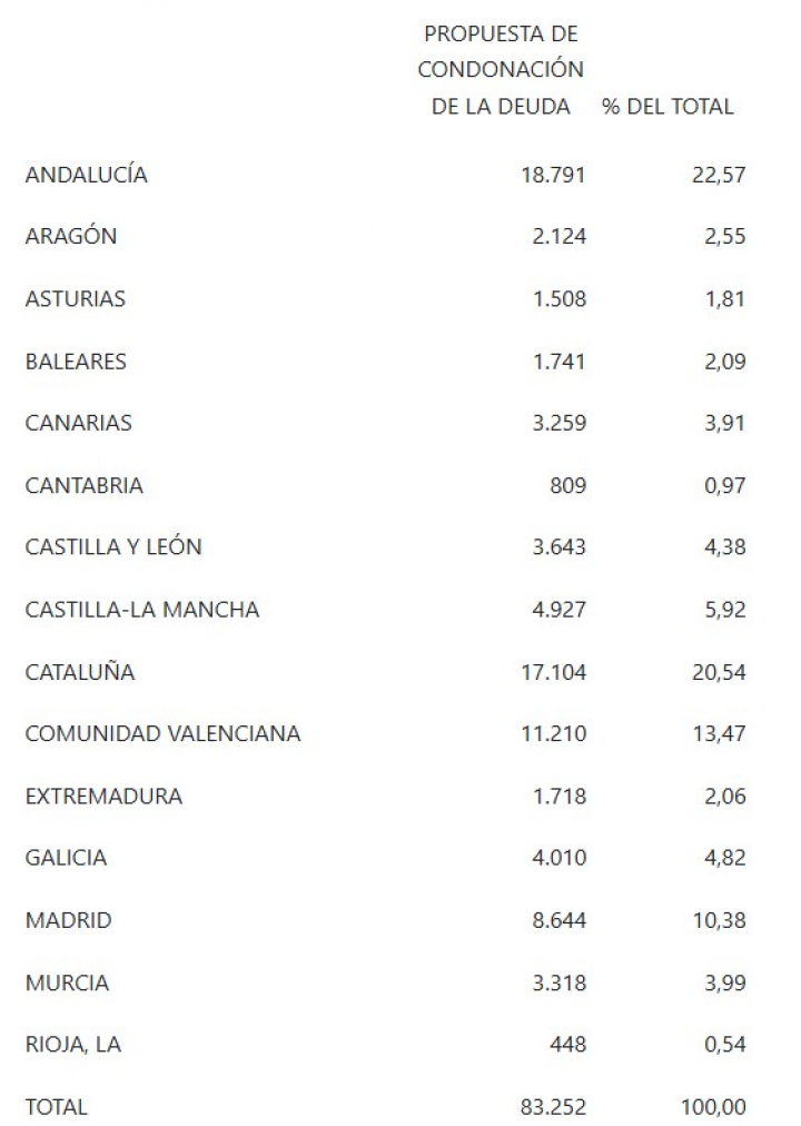 En términos absolutos, Andalucía es la comunidad que podrá condonar más deuda según la propuesta presentada. En concreto, el Estado asumiría 18.791 millones de deuda de Andalucía por 17.104 de Cataluña, 11.210 (13,47 %) de la Comunidad Valenciana y 8.644 (10,38 %) de Madrid.