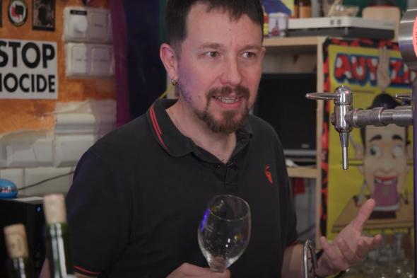 Pablo Iglesias enseña la marca de cerveza que vende en su taberna: tiene su aquel