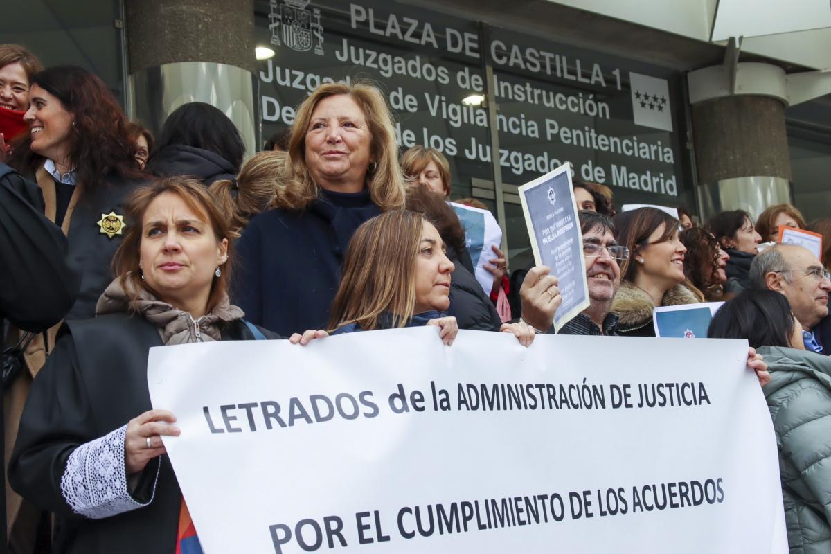 Poco antes de que empezara la reunión, miembros de las tres asociaciones -la Unión Progresista de Letrados de la Administración de Justicia (UPSJ), la Asociación Independiente de Letrados (AinLAJ) y el Ilustre Colegio Nacional de Letrados- se congregaron a las puertas del Ministerio para manifestarse y apoyar a la comitiva que entró a la sede a negociar. La concentración se disolvió poco después porque, según han indicado los LAJ en su comunicado, Justicia les pidió "como signo de buena voluntad" que se retiraran de las puertas del Ministerio.