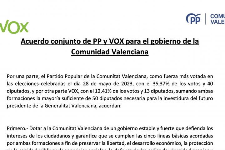 Adiós a la Memoria Histórica en la Comunidad Valenciana, tal y como reza el propio documento que habla, en su punto número dos, de "garantizar la libertad de memoria" y de que "se derogarán las normas que atacan la reconciliación en los asuntos históricos".