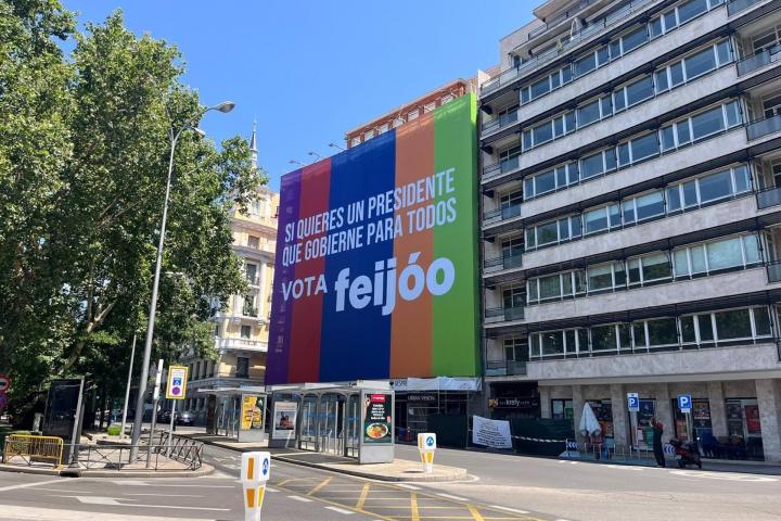 El PP ha desplegado este domingo una lona en el número 60 de la Castellana (Madrid) con los colores de las principales formaciones políticas españolas con la que el candidato a la Presidencia del Gobierno, Alberto Núñez Feijóo, apela al voto de todos los españoles "sin importar el color político".