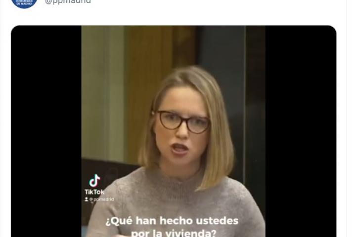 En ella, se ve un fragmento de una intervención de la respuesta de la presidenta madrileña, Isabel Díaz Ayuso, a una pregunta de Alonso. "¿Qué han hecho ustedes por la vivienda?", le interrogó la dirigente de la formación morada.
