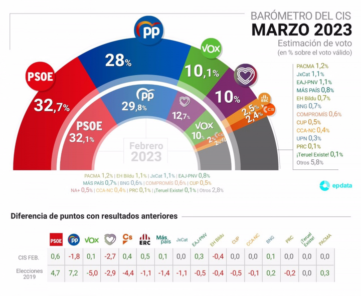 Los socialistas vuelven a tocar techo con un 32,7% de estimación de voto frente a un PP en retroceso. Unidas podemos pierde también casi tres puntos con respecto a febrero.