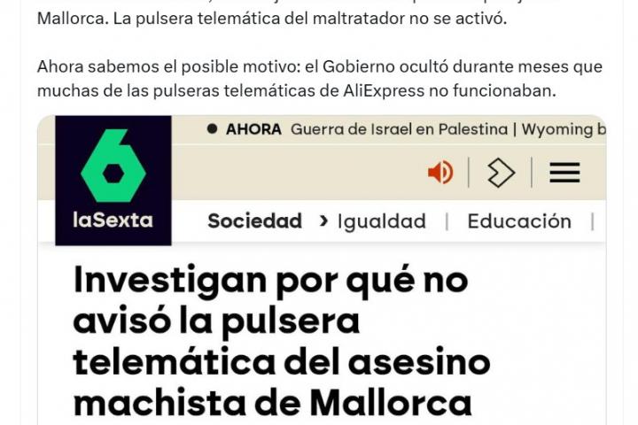 Este domingo, la cuenta oficial del PP en la red social X publicaba el siguiente tuit: "En diciembre de 2024, una mujer fue asesinada por su expareja en Mallorca. La pulsera telemática del maltratador no se activó. Ahora sabemos el posible motivo: el Gobierno ocultó durante meses que muchas de las pulseras telemáticas de AliExpress no funcionaban".