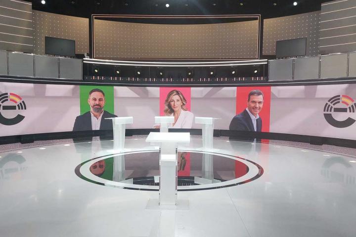 La cadena pública, que ya celebró la semana pasada un debate a siete con los portavoces de los siete partidos con grupo parlamentario propio en el Congreso, ha publicado estos días imágenes del plató en el que se desarrollará este esperado debate "a tres". Cada candidato estará ante un atril para hablar durante unos 90 minutos de cuestiones como la economía, las políticas sociales, y los pactos de Estado y pactos postelectorales.