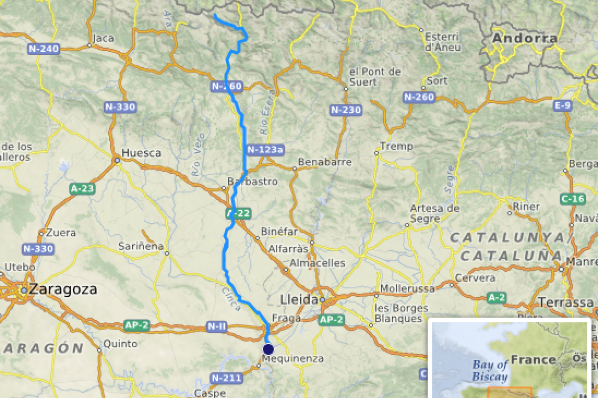 El río Cinca nace en el parque nacional de Ordesa y Monte Perdido, en Aragón, y recorre diversas localidades de Huesca como la propia Fraga o Monzón, entre otras.