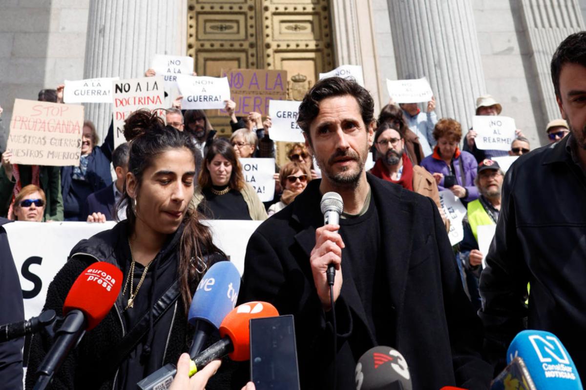 Los actores Carolina Yuste y Juan Diego Botto han leído este miércoles frente al Congreso un manifiesto contra el rearme y la guerra en Europa suscrito por varias asociaciones y compañeros de profesión como Javier Bardem, Aitana Sánchez-Gijón, Luis Tosar y la cantante Rozalén, entre otros.
