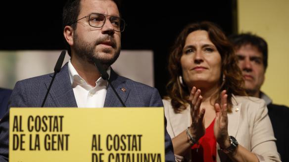 El presidente de la Generalitat y candidato a la reelección, Pere Aragonès, acompañado de la vicepresidenta de la Generalitat, Laura Vilagrá, valora los resultados obtenidos por la formación política este domingo en las elecciones catalanas.