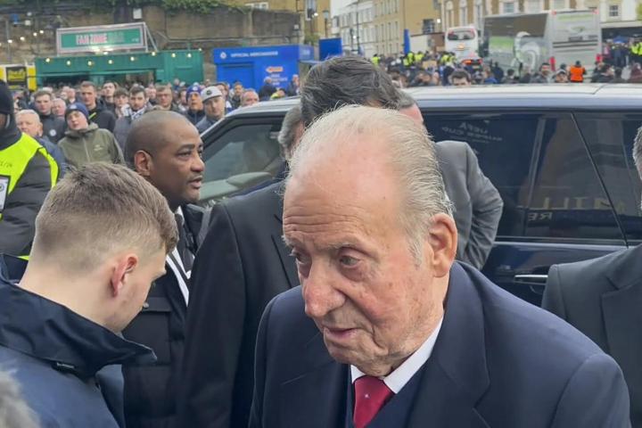 El emérito, cuya visita privada a Londres ha despertado gran atención mediática, llegó a las inmediaciones del estadio en un vehículo todo terreno negro tras el autobús del Real Madrid y a la vez que el presidente del club madridista, Florentino Pérez, con quien no se le vio saludarse.