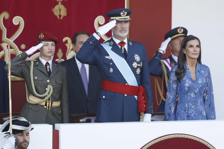 Al contrario del recibimiento a Sánchez, los congregados sí han recibido a Felipe VI y a la Familia Real con aplausos y gritos de '¡Viva España!". A su llegada, han sido recibidos con honores militares, tras lo cual don Felipe ha pasado revista al Batallón de Honores de la Guardia Real. La princesa Leonor, vestida con el uniforme de gala del Ejército de Tierra, ha sido el otro foco de atención del acto al volver al 12-O tras dos años de ausencia por sus estudios en Gales y justo después de jurar la bandera en la Academia Militar de Zaragoza.