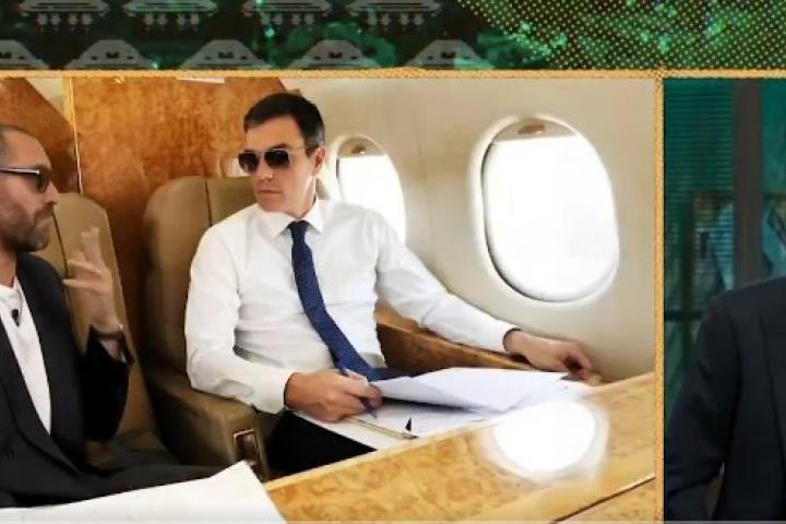 El humorista simulaba estar manteniendo un diálogo con el presidente mientras ambos volaban en el Falcon. "Vamos a ver, Pedro. Si me dicen Aldama, ¿qué Aldama? ¿qué Leire? ¿Y qué hacemos con García-Page? Y el Falcon, ¿qué? Que yo lo necesito. Begoña lo coge el martes y el jueves para pilates. A ver cuándo lo podemos coger nosotros", le decía.