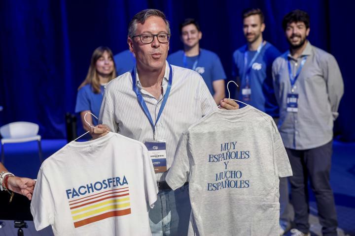 Bajo el lema 'Toma Partido por España', el PP ha inaugurado este viernes su XXI Congreso Nacional del partido que se celebrará este fin de semana en Madrid, en un encuentro en el que los 'populares' reelegirán a Alberto Núñez Feijóo como presidente en un momento de alto voltaje político por las consecuencias del 'caso Cerdán' en el PSOE. Como en otros cónclaves, los 'populares' venden 'menchandising' como camisetas o sudaderas, en este caso con frases de Pedro Sánchez como "fachosfera" o "Son las cinco y todavía no he comido".