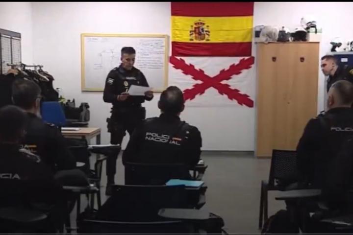 En esas imágenes se aprecia que en una de las dependencias de la comisaría en la que estaban reunidos agentes para tratar el dispositivo de seguridad a llevar a cabo ese día se puede ver de forma "prominente" la bandera de la cruz de Borgoña.