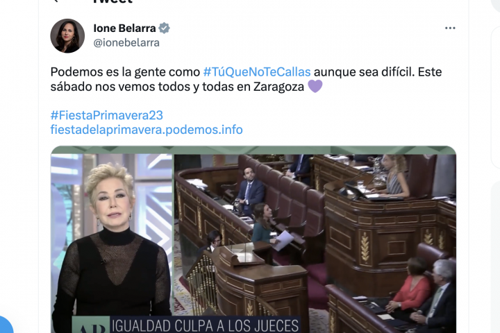 Un largo vídeo en el que se alaba la figura de las dos ministras del partido en el Gobierno, Irene Montero y la líder del partido, Ione Belarra, así como las leyes que han sacado adelante.