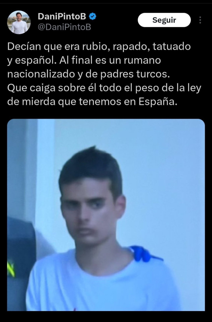 Dani Pinto Bausela, concejal de Vox en el Ayuntamiento de Terrassa (Barcelona) ha difundido un bulo con la cara del asesino de Mateo en el que indicaba que era una persona de origen rumano. "Decían que era rubio, rapado, tatuado y español. Al final es un rumano nacionalizado de padres turcos. Que caiga sobre él todo el peso de la ley de mierda que tenemos en España", publicaba en su cuenta de X, que ha acabado poniendo en modo privado para que no se pudiera denunciar la cuenta o señalar la mentira cargada de racismo.