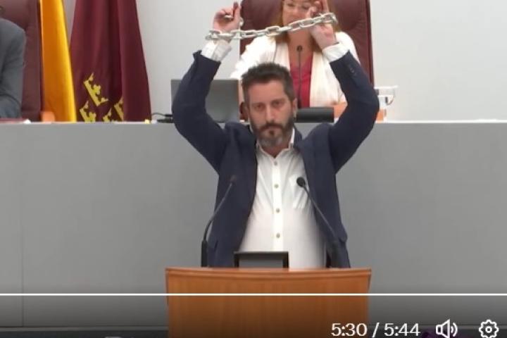 Egío, el primer diputado sancionado en la historia del Parlamento murciano, ha tomado la palabra en el turno de intervención final del pleno y ha pedido un minuto de silencio por "esta Asamblea Regional sometida a despotismo; vulnerada, violada, atropellada y deshonrada una vez más”, tras lo que se ha encadenado las manos, alzándolas sobre su cabeza, para iniciar su protesta en silencio.