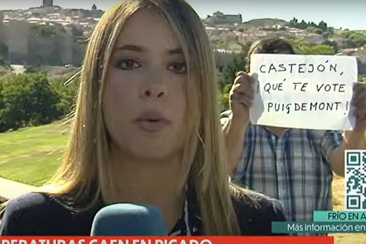 Un espontáneo ha irrumpido este viernes en un directo de RTVE para mostrar un cartel contra Sánchez con el siguiente texto: "¡Castejón, que te vote Puigdemont!". El momento se ha producido durante una conexión con Ávila durante el programa "La hora de la 1" mientras una periodista de nombre Andrea informaba de que la ciudad había amanecido con temperaturas inferiores a los diez grados.