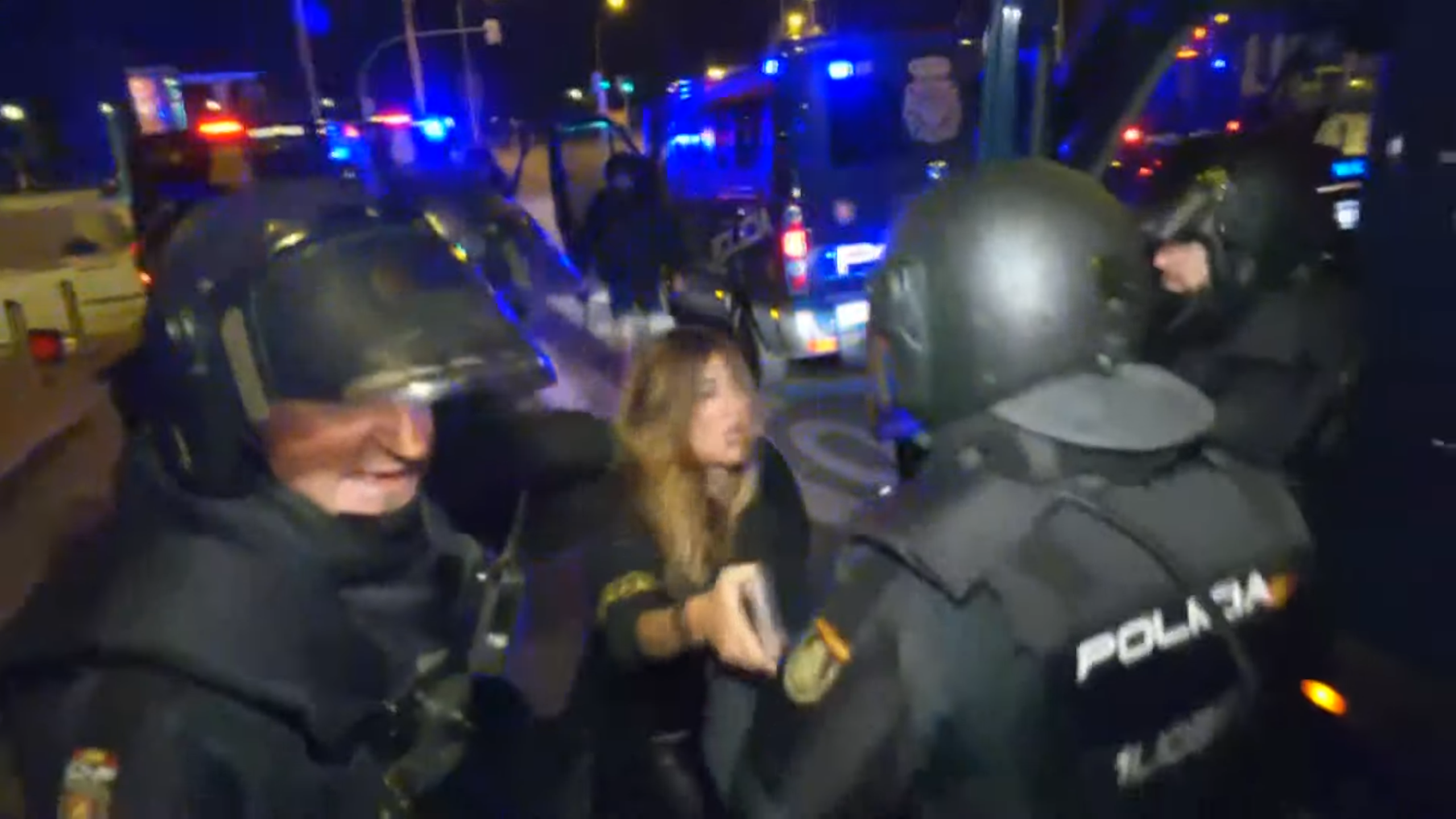Una detenida en Ferraz intenta escapar del furgón policial a la carrera y deja una escena surrealista en plenos disturbios