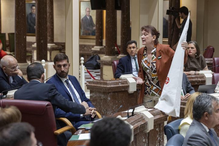 La diputada de Podemos en el Parlamento de Murcia María Marín ha regalado este miércoles un capirote del Ku Klux Klan al grupo parlamentario de Vox para denunciar "el pogromo de Torre Pacheco". "Quería traerte un regalo esta mañana para que la próxima vez que salgan ustedes de cacería vayan vestidos en condiciones", le dice Marín al presidente de Vox en Murcia, José Ángel Antelo.