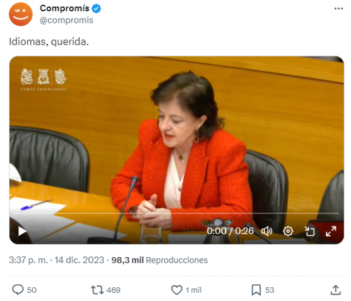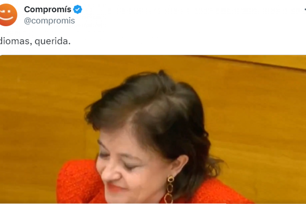 Así se puede observar en el vídeo del momento que Compromís ha publicado en su cuenta de X, antes Twitter, junto a las siguientes palabras: "Idiomas, querida".