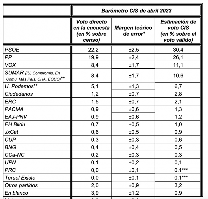 No varía la cosa si miramos el voto directo, es decir, la respuesta espontánea del encuestado sin la 'cocina' que le aplica el CIS en base a la simpatía y al recuerdo de voto.