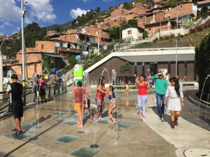 Niños jugando en una Unidad de Vida Articulada (UVA) en Medellín.