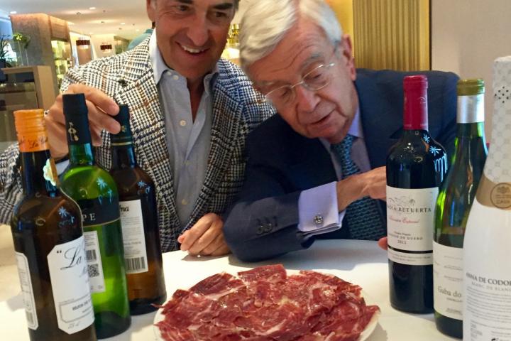 Pues bien, Jesus y yo hemos tenido la oportunidad de llevar a cabo muchísimas catas, muchísimas pruebas, combinando finísimas lonchas de jamón ibérico puro de bellota, tanto de Huelva-jabugo como de Extremadura, los Pedroches o Guijuelo, con diferentes bebidas. Concretamente, con fino, manzanilla y oloroso de jerez; con cerveza; con champagne o cava; con blanco afrutado y blanco seco con madera; con tinto crianza, reserva y gran reserva y, por supuesto, incluso, con vinos licorosos, vendimias tardías y algún oporto.