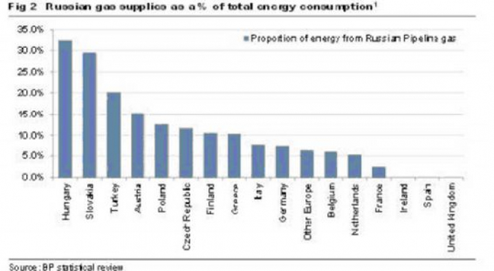 ¿Pero cúal es el problema? A medida que las sanciones contra Rusia han aumentado en el últimas semanas por la crisis de Crimea, Rusia ha amenazado con detener el suministro de gas a Ucrania, lo que supone alrededor del 30 % del gas de la UE. Si el Kremlin cierra el grifo del gas, algunos países de Europa se verán más afectados que otros, como se puede observar en el gráfico.