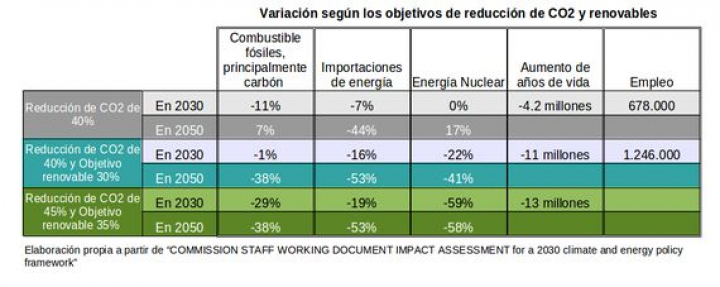 Del mismo modo, con objetivos renovables disminuye mucho más el uso de carbón, disminuye más la dependencia energética y aumentan los años de vida de los europeos, como se observa en la tabla. Sin objetivos renovables la energía nuclear aumentará en Europa hasta un 17% en 2050; si hay apoyo a las energías renovables en cuyo caso la nuclear disminuye hasta casi un 60%.