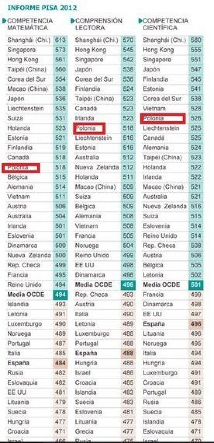 Polonia tiene un PIB inferior al español y el porcentaje del presupuesto dedicado a educación es muy inferior al de España. Aun así han conseguido pasar de estar hace unos años por debajo de la media de los países de la OCDE a tener uno de los mejores sistemas educativos del mundo, según el último informe PISA. ¿Cómo se consigue eso?