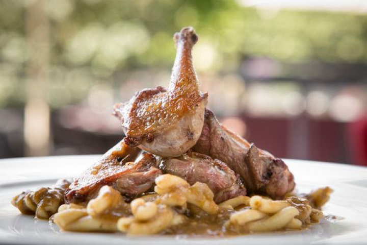 Por razones de estacionalidad, en estos momentos nos traemos entre manos el de granja. Haber sido sacrificado en torno al mes de vida marca su ternura. La técnica empleada para su cocinado es el asado: una vez limpia y deshuesada la pieza, pasamos las pechugas y los muslos por la sartén a fuego vivo para convertir la piel en una costra fina y sellar el resto de la carne; un breve paso por el horno (no tan corto en el caso de las patitas, más correosas) matizará la cocción y conseguirá un punto jugoso en su interior, manteniendo esas tonalidades rojizas iniciales.
