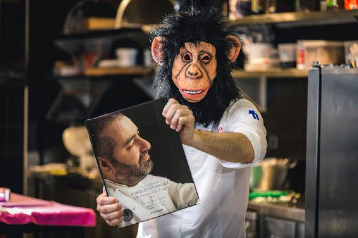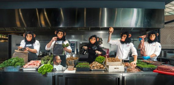 ¿Qué caracterizaba a estos simios? ¿Eran seres geniales? No, nada de eso. La cualidad que les definía era la perseverancia, el día que les faltara lo perderían todo en cualquier momento. Cada mañana, acudían a sus cocinas y de manera meticulosa revisaban la calidad de las alcachofas, de las acelgas o de las coliflores que Pau, desde la huerta, con el inicio del invierno, les enviaba. Comprobaban la firmeza y frescura de lubinas, doradas, jureles y salmonetes recién llegados de Puerto. Flipaban comprando la seta de cardo y el pie azul. El silencio se adueñaba del ambiente al limpiar las piezas de caza como los patos, las cercetas, los conejos o los gamos, tal calma delataba la emoción sentida por los simios en ese momento. Y así con los mejillones de Francia. Y así con el lomo de carne del País Vasco... "El éxito final de un plato depende de la calidad original de la materia prima", afirmaba un simio algo barrigón y sin pelo en la cabeza.