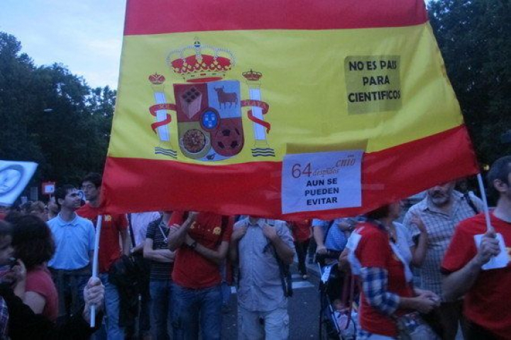 También llevaban pancartas los del Centro Nacional de Investigaciones Oncológicas (CNIO). Su directora, María Blasco, va a despedir (o no renovar) a 64 de sus 470 trabajadores, la mayoría del área de Biotecnología y Terapias Experimentales. "No nos hagas fotos, que toman represalias", me avisaron los manifestantes. Qué triste. Y, sin fotos y sin nombres, me aseguraban que "antes el CNIO tenía patrocinios", pero "llevan un año sin ellos porque no hay coordinación entre la gerencia y la dirección científica, así que al final llega la ruina". "Después de 15 años para llegar a ser un centro de excelencia, en dos años se lo cargan", acusaban. Y me hacían saber que Blasco quiere recortar justamente en cinco unidades que hace unos días han participado en un trabajo en la revista Nature que dió la vuelta al mundo. "En terapias había más de 50 personas hace dos años, ahora quedarán 12 o 13″, comentaban.