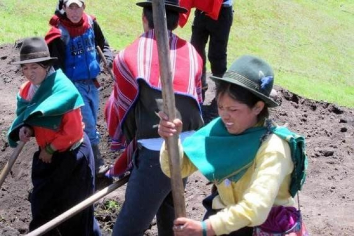 En una ladera del páramo, encontramos una minga, la reunión de una comunidad para realizar un trabajo entre todos y para todos. Están picando y la mayoría son mujeres. Es la obra de una canalización del sistema de riego que también financia Manos Unidas y que permitirá regar por aspersión campos y pastos situados mil metros más abajo. "Mire, tengo dos vacas que me dan unos 30 litros de leche cada una. A 30 centavos el litro, comprenderá no me dan para vivir", me explica la joven madre Teresa Marcatona, cuando bajamos hacia una aldea en la caja de un camión, tragando polvo.