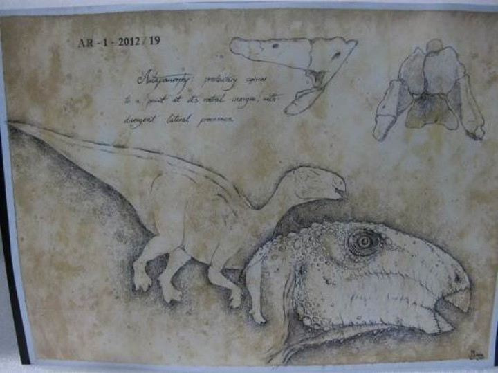 Cuando lo presentaron hace unos días en Teruel, el momento de impacto se produjo al levantar un cajón y ver aparecer el cráneo casi completo de aquel prehistórico animal que llegó a medir ocho metros de largo y pesar dos toneladas. Después, Luis Alcalá me mostraba con entusiasmo lo que llama su 'autapomorfia', ese curioso pico, con forma de quilla de barco, que lo hace tan especial. "Mira, es un rasgo que indica que era un animal muy evolucionado. Sabemos que comía plantas, pero ahora hay que averiguar de qué tipo eran para tener este pico triangular, porque ninguno de su tiempo lo tenía igual", apuntaba.