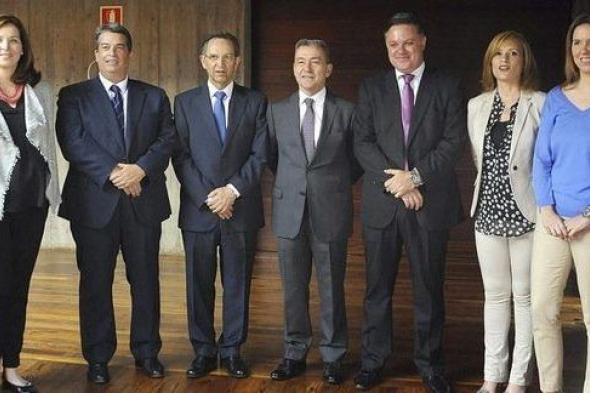 María Lorenzo, a la izquierda, durante la toma de posesión del Consejo Rector de la Radio Televisión Autonómica Canaria, junto al entonces presidente del Gobierno, Paulino Rivero (en el centro) y el entonces presidente del Parlamento, Antonio Castro (segundo por la izquierda)/EFE