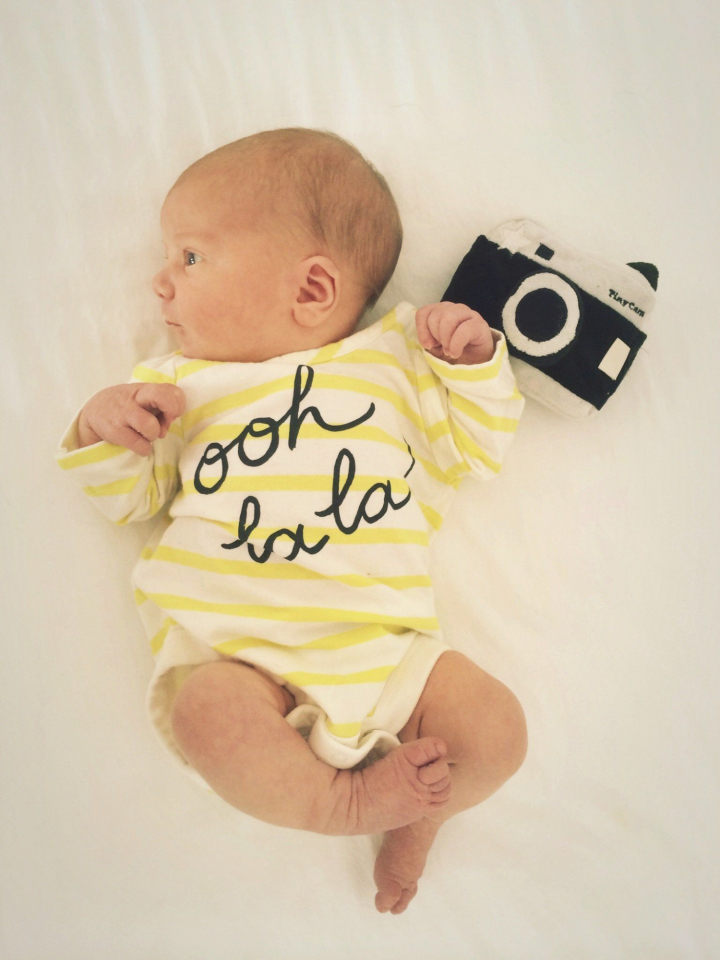Me siento como si estuviera tratando de darla a luz a través de un body. Esto es de locos. Pero es un trajecito tan mono el que le estoy poniendo, el tercero del día. No me extraña que tenga que hacer la colada 16 veces al día. Vale, por fin se lo he puesto. ¡Adorable!