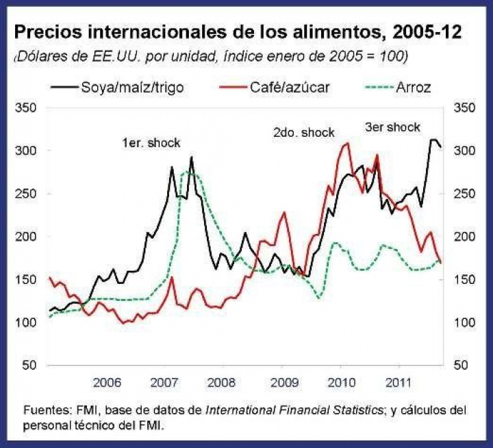 Dos puntos a resaltar son el hecho que el alza reciente de precios de los alimentos ha sido menos aguda que en los dos episodios anteriores (a mediados de 2008 y comienzos de 2011), y que se observan diferencias importantes en la evolución de precios de las diversas materias primas. Por ejemplo, mientras el precio de la soja, el maíz y el trigo aumentó drásticamente, el del café y el azúcar ha caído. Según las proyecciones de mercado, el precio de la soja, el maíz y el trigo se mantendrá elevado el resto de este año, pero luego bajará gradualmente a medida que se normalicen las condiciones de la oferta.