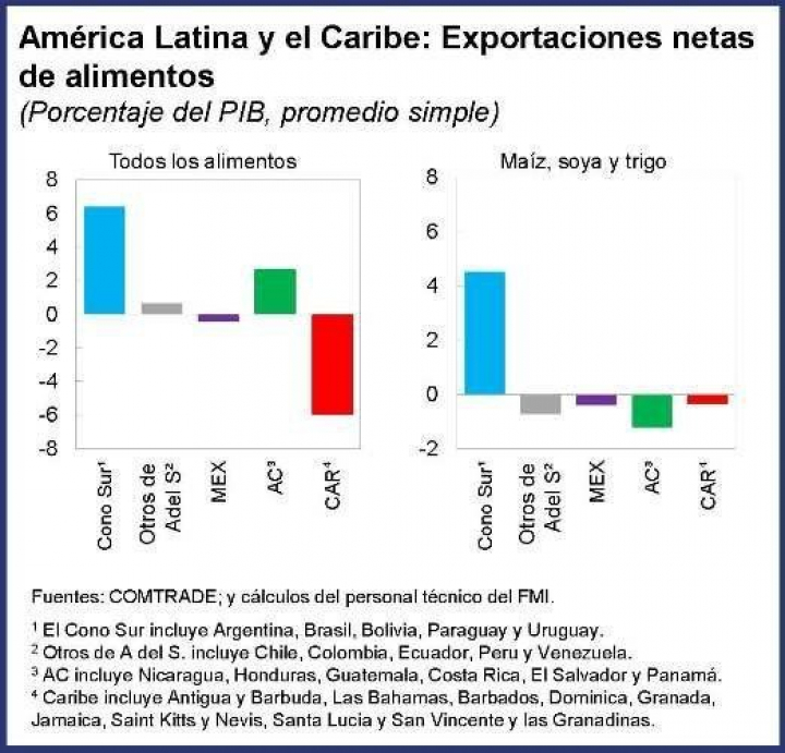 El impacto del aumento de precio de los alimentos sobre la balanza de pagos también será desigual en distintas áreas de la región. Los países del Cono Sur (que exportan soja, maíz y trigo) son los que más podrían beneficiarse, en tanto que los del Caribe, que importan grandes volúmenes de alimentos, serían los más perjudicados.