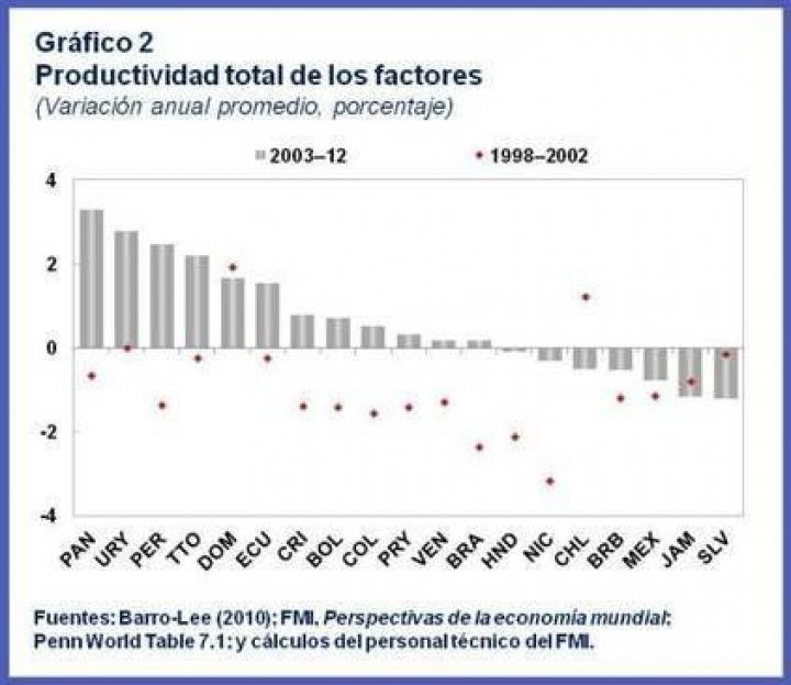 Por lo tanto, hay pocas probabilidades de que el fuerte crecimiento de la región sea sostenible a menos que la acumulación de capital aumente drásticamente (por ejemplo, impulsada por un aumento de las tasas de ahorro, que son aún muy bajas en la región), el capital humano crezca significativamente (existe amplio margen para mejorar la calidad de la educación) o aumente sustancialmente la productividad total de los factores. De hecho, pese a haber mejorado en los últimos tiempos, la productividad total de los factores sigue siendo débil en comparación con las economías emergentes de Asia, lo cual explica la mayor parte del diferencial de crecimiento entre ambas regiones. Por ende, estimular el aumento de la productividad continúa siendo un reto y una prioridad fundamental para América Latina.