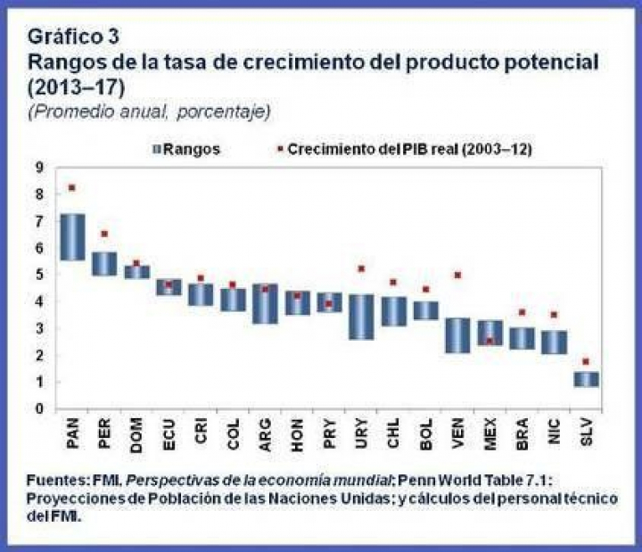 Nuestro análisis sugiere que será más difícil sostener las elevadas tasas de crecimiento recientes. Mientras que en promedio la región creció 4½% por año en 2003-12, nuestras estimaciones indican que la tasa de crecimiento potencial promedio del PIB en 2013-17 está más cerca de 3¼% anual. De hecho, las altas tasas de crecimiento observadas en los últimos años son superiores al rango de crecimiento potencial del PIB en la mayoría de los países (gráfico 3). Los rangos del producto potencial varían significativamente entre un país y otro, generalmente debido a diferencias entre las tendencias de envejecimiento de la población, las tasas de participación en la fuerza laboral, las tasas de ahorro y de inversión en capital físico y humano, la dotación de recursos naturales, el desempeño en términos de productividad y otras características propias de cada país.