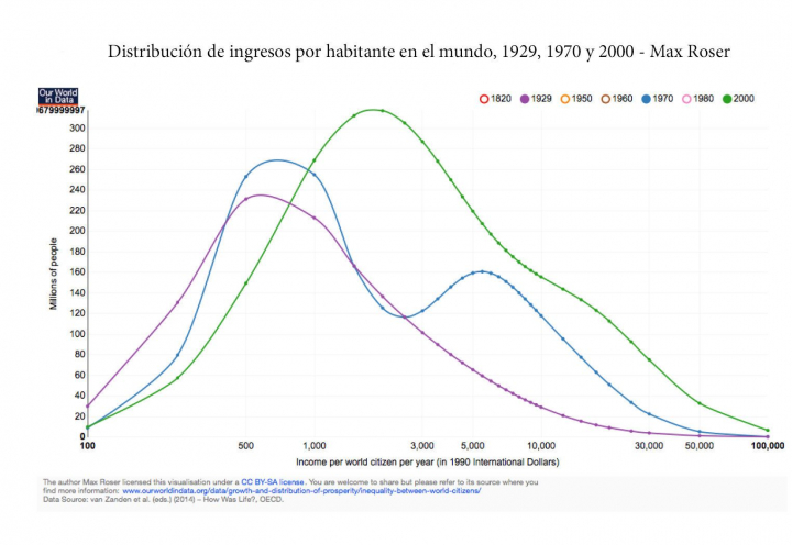 Lo que nos dice el gráfico es que en 1929 (línea violeta) la inmensa mayoría de la población mundial ingresaba menos de 1.000 $i por persona al año; y menos del 10 por ciento de la población mundial ingresaba más de 5.000 $i. En 1970 (línea azul) la gran mayoría de habitantes del planeta continuaban ingresando menos de 1.000 $i, pero un importante subconjunto de la población mundial había conseguido abandonar el pelotón de cola y sumarse a los privilegiados que disfrutaban de más de 5.000 $i.