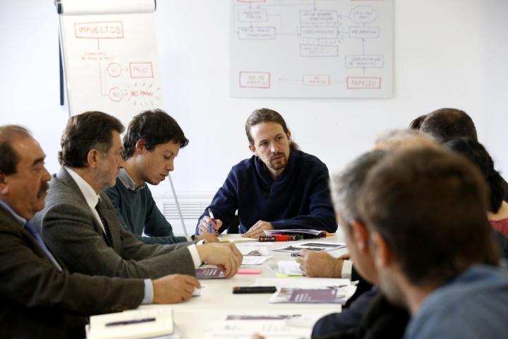 El secretario general de Podemos, Pablo Iglesias, durante la reunión que ha mantenido con representantes de pymes y autónomos/EFE.