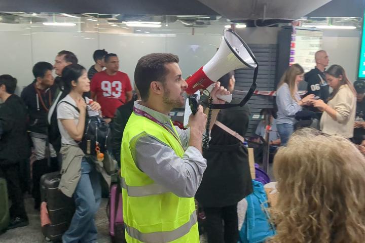 Sí, por un megáfono de mano que esta tarde estaba ayudando a poner algo de orden en mitad del 'apocalipsis'. Con las pantallas inservibles, el rumor constante que provoca una aglomeración de este calibre y la masa de gente que se acercaba sin cesar a los empleados de la estación a preguntar por su caso particular, este instrumento lograba paralizar el caos un instante y captar toda la atención.